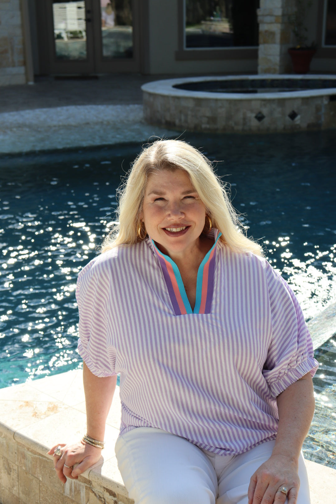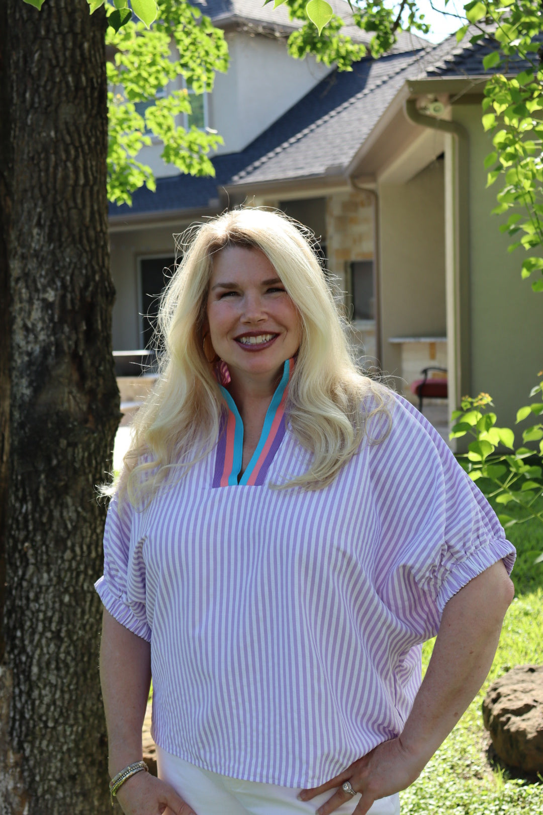 Oversized fit sear sucker lavender stripe top with color block color. Model is wearing a medium.