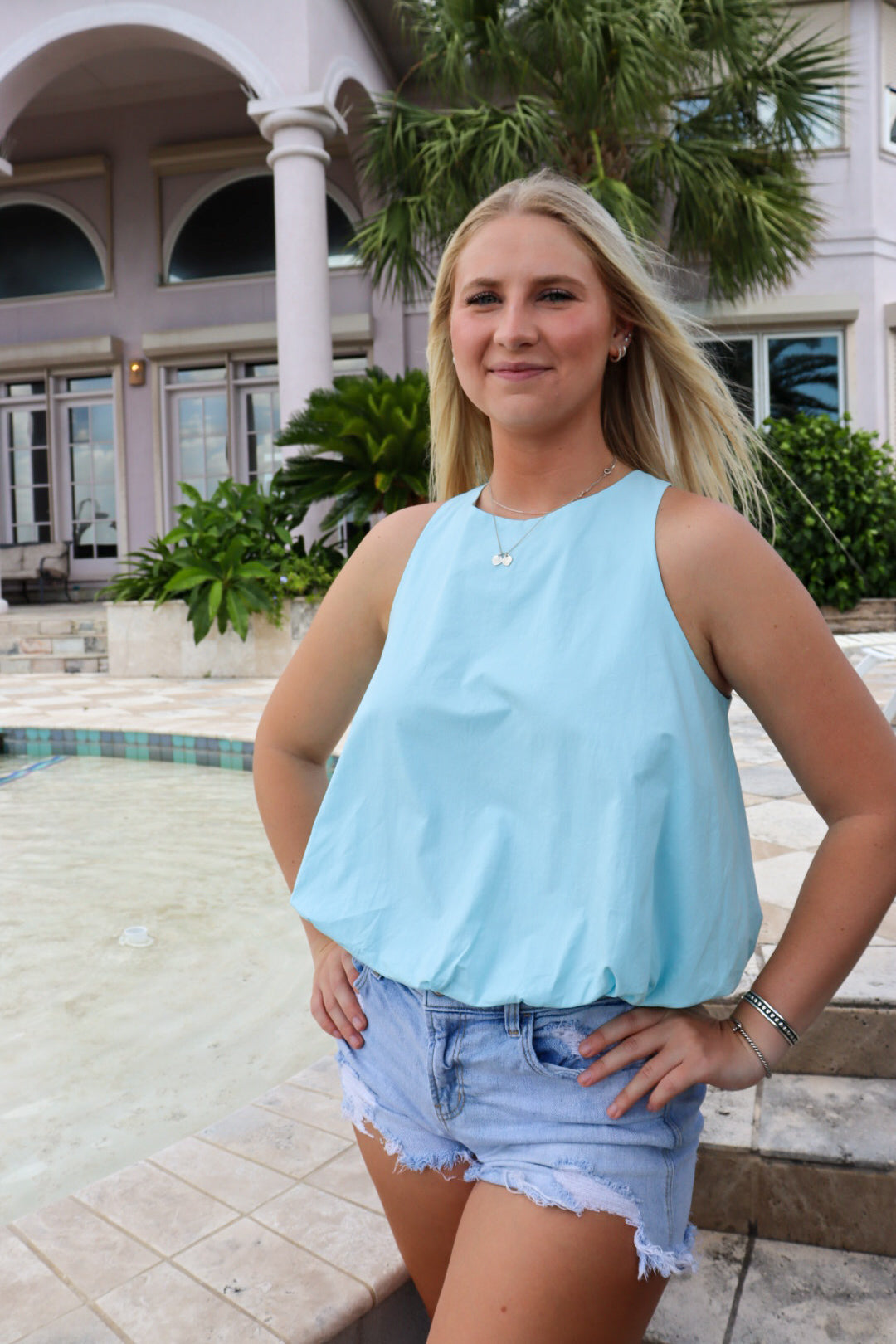 Bubble style is totally in and this open back makes it 10x better! Model is wearing a size medium.