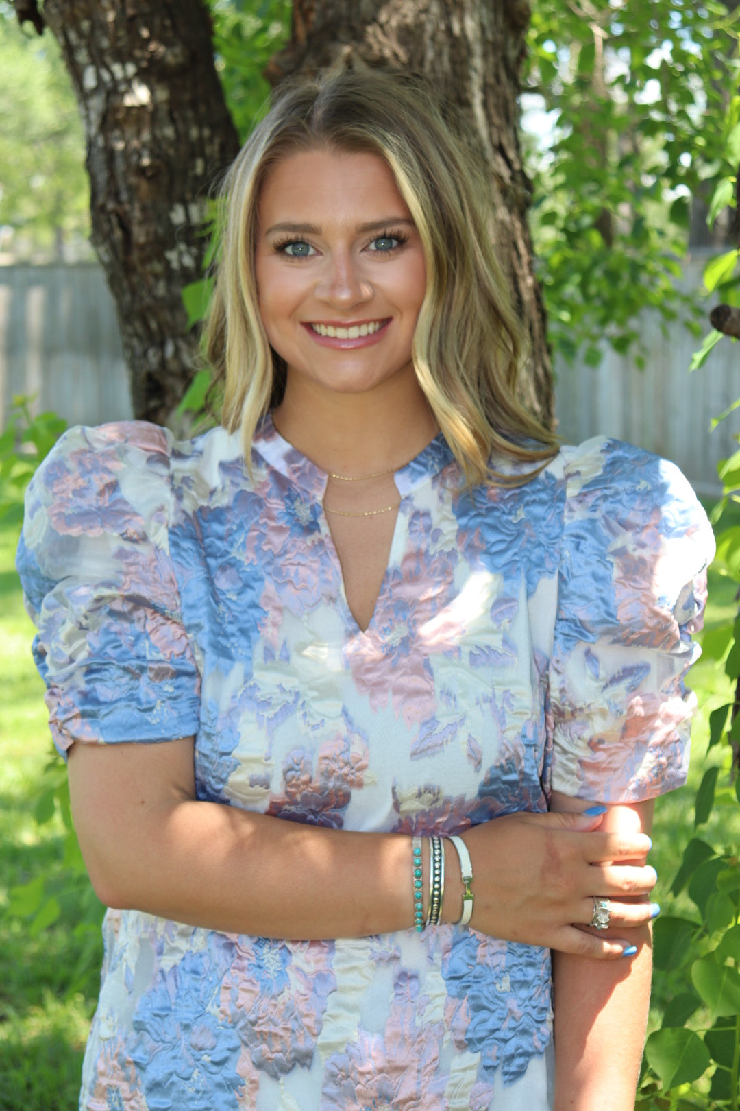 The prettiest top ever! V neckline, puff sleeves, and double lined. Texture pops so much on this top. Model is wearing a medium.