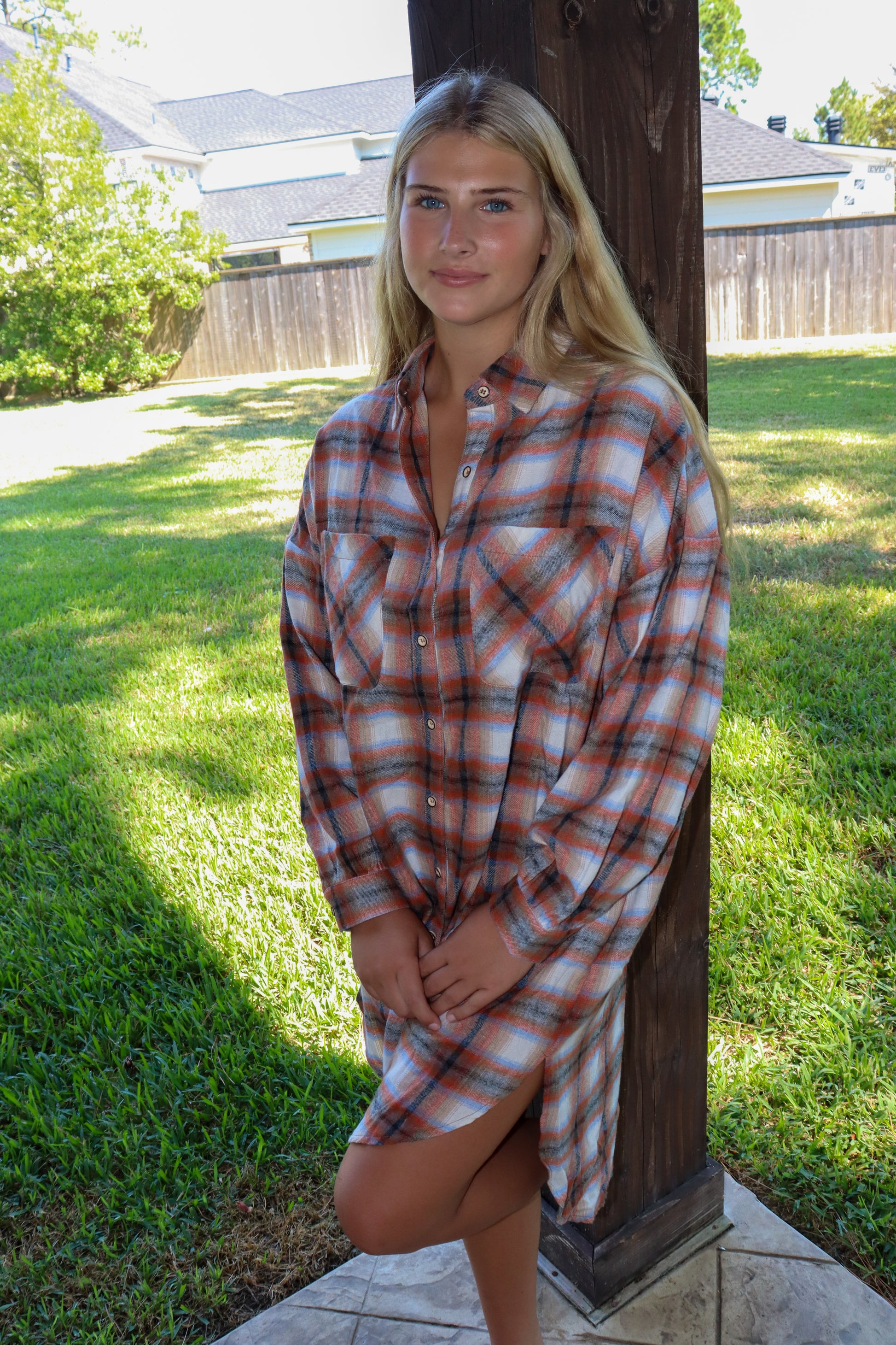 Can be worn as a cardigan or dress! Such pretty fall colors, Model is wearing a small.