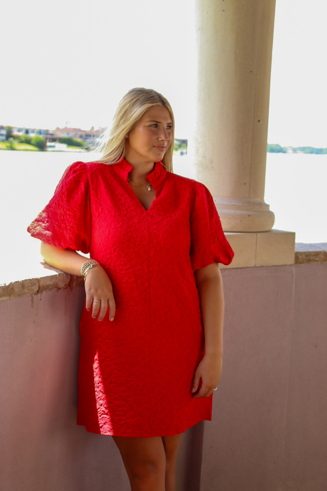 What a perfect red dress! Texted floral for subtle detail and style. Stretchy material with a ruffle collar and pockets! Model is wearing a size small.