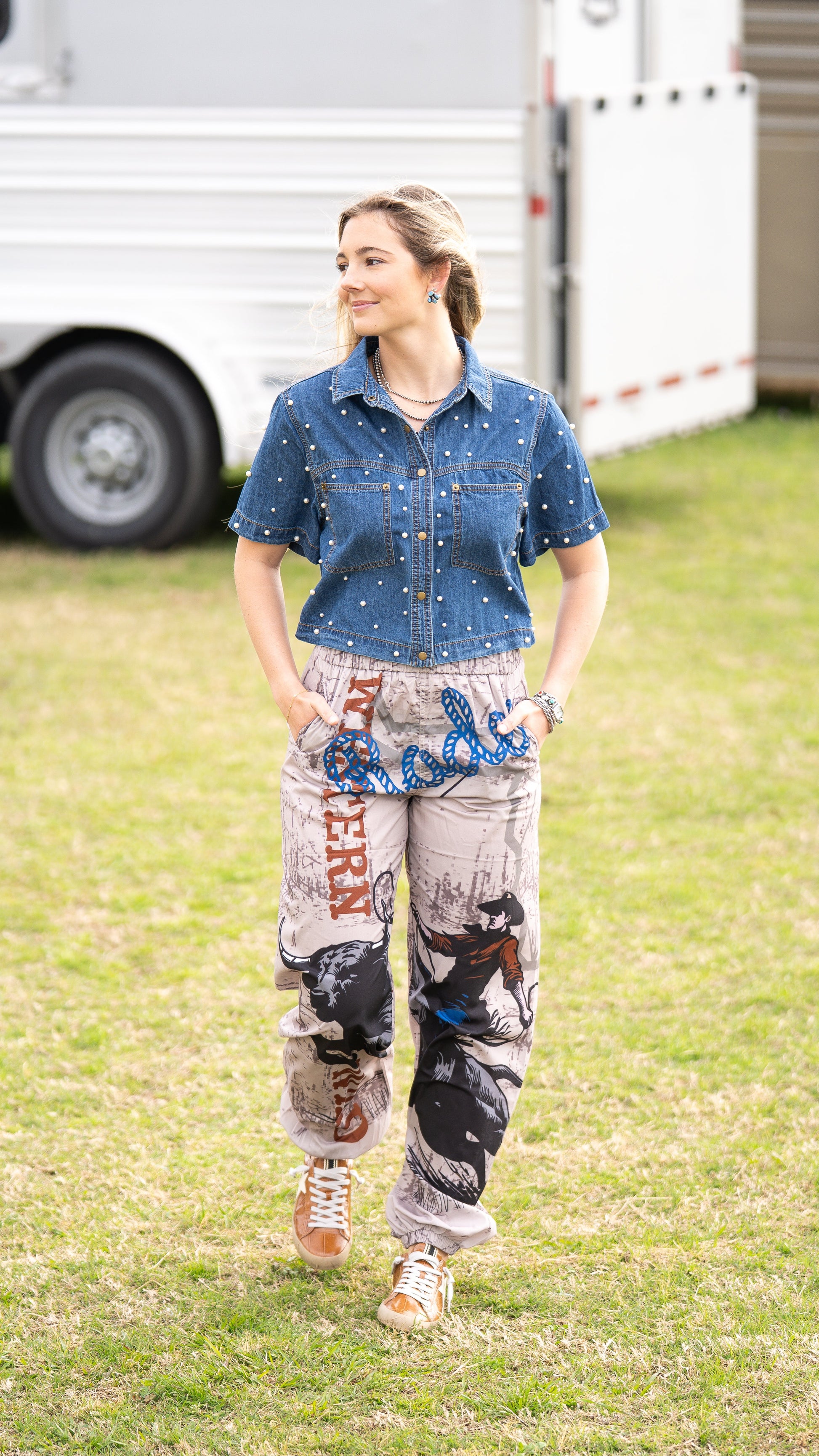 Vintage design rodeo rope joggers! Elastic waistband and at the ankles.