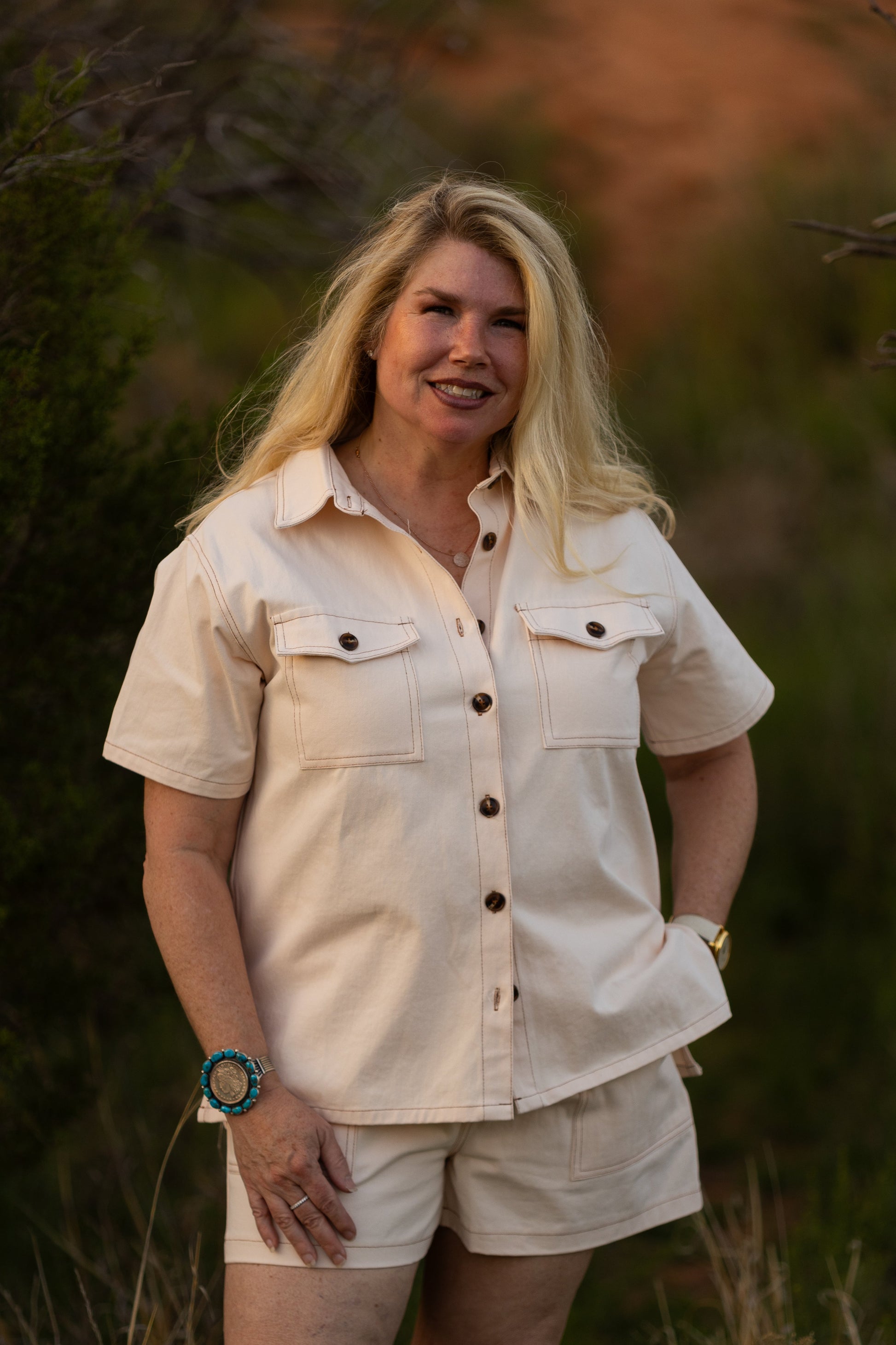 Cream colored button up set with brown stitching! Tortoise shell colored buttons to add a pop of color. Elastic waistband shorts! Model is wearing a size medium.