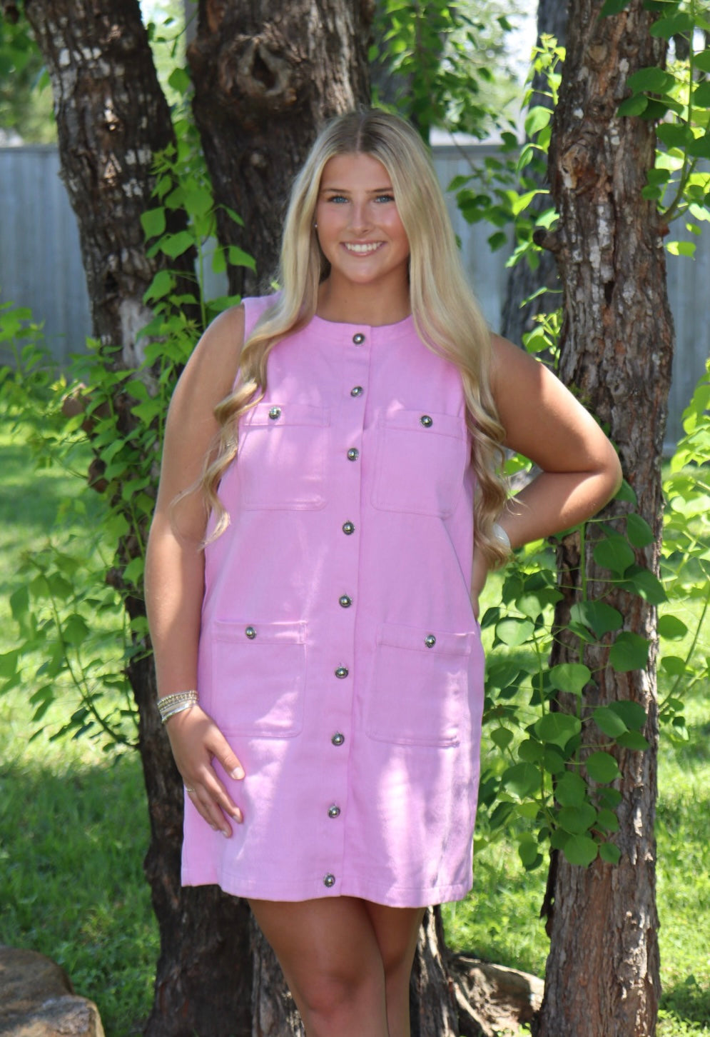 Denim material fully functioning button dress. The buttons have such a pretty detail! Lavender/pink color. Model is wearing a medium.