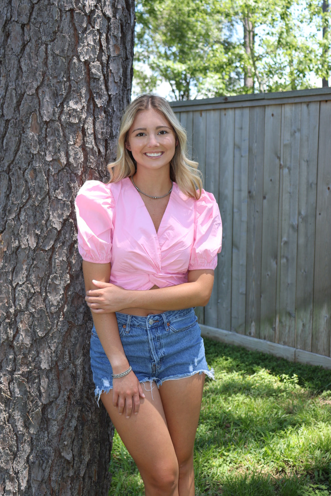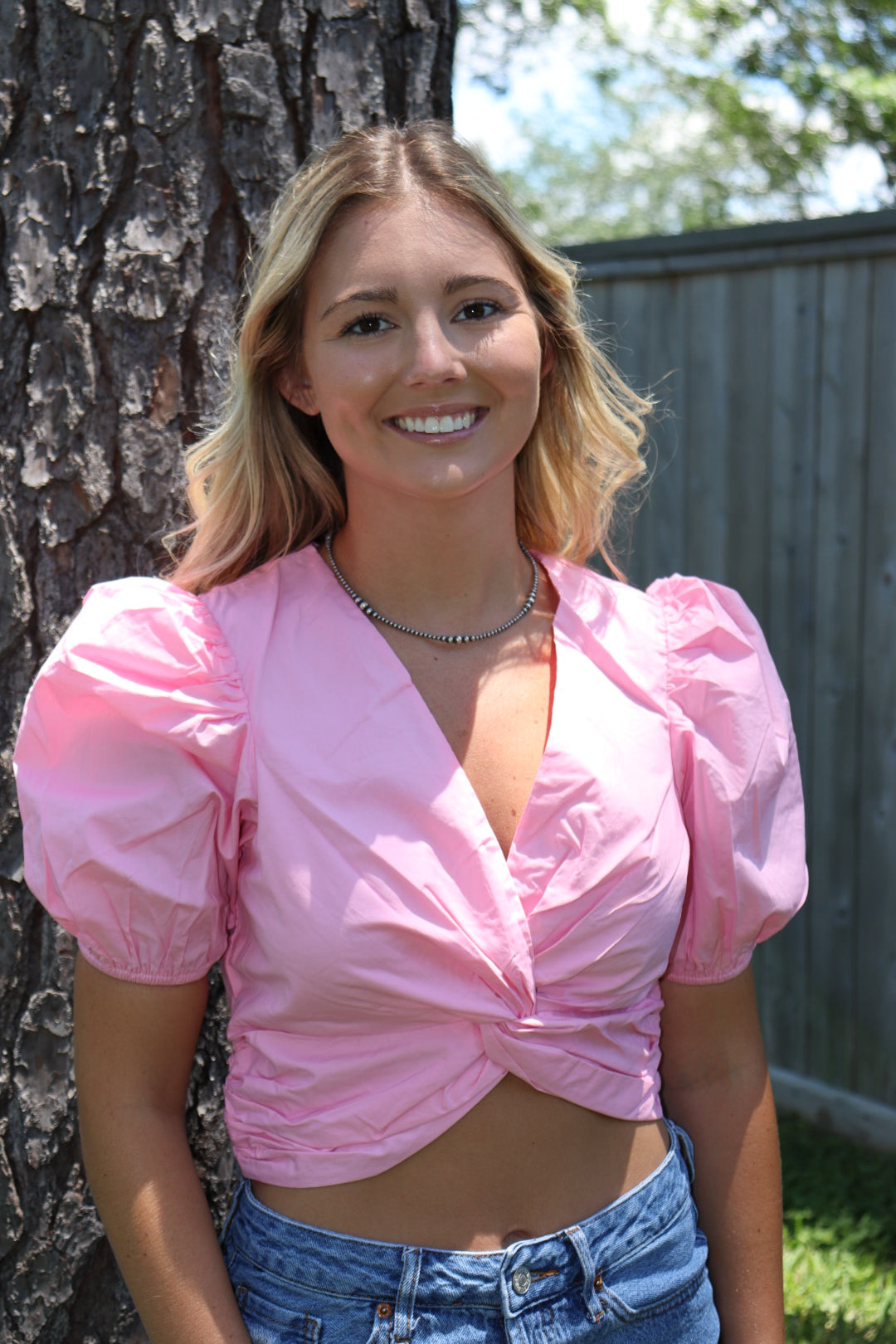 Super flattering puff sleeve crop top! Gathered in the back as well and a side zipper for convenience. Model is wearing a small.